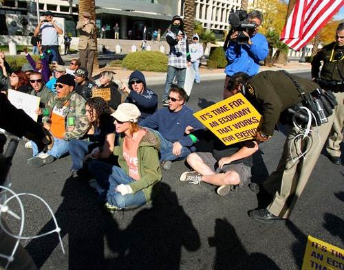 November 18 saw the first arrests in the movement, as Occupiers around the country carried out more disruptive demonstrations in order to commemorate two months since the protests began. Roughly twenty protesters wandered onto Las Vegas Boulevard in front of the Federal Building and sat in the road, linking arms and chanting. Delightful as this may have appeared, it wasn’t bringing any tourist money in, so the police stepped in and hauled everyone in.