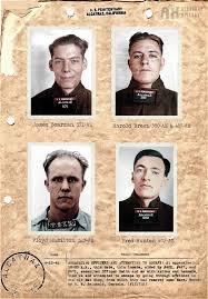 On to April, 1943, when four men armed with shivs took two guards as prisoners, then stripped down to their underwear and greased themselves up before leaping out a window and down a 30-foot cliff into the freezing water. They had stuffed army uniforms into floating cans (the damn cans idea again!), but left two behind. No problem, within minutes the guards saw them and opened fire. James Boarman took one in the back of the head. A boat pulled up alongside Harold Brest and he was taken back into custody, along with Fred Hunter. The last escapee hid out in a cave for a couple of days, but decided the water was too cold, and slipped back into the building where he was captured.