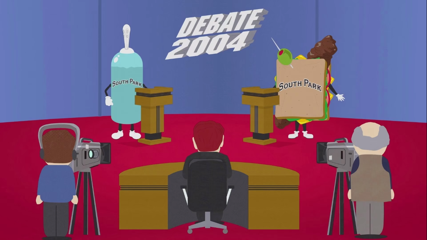 No matter, the assumption is complete crap. Any fan of South Park would know better than to assign the show a political cubby-hole. Parker and Stone said it most clearly in their 2004 episode in which the students of South Park Elementary vote on their new mascot, between a Giant Douche or a Turd Sandwich. Stan Marsh, the show’s perennial voice of wisdom, had been resisting casting a vote. Finally he concedes, “I learned that I’d better get used to having to pick between a douche and a turd sandwich because it’s usually the choice I’ll have.”
