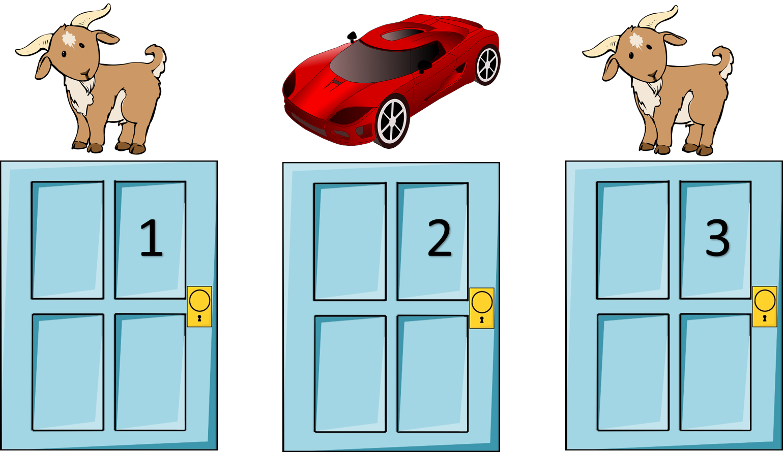 Behind the other two doors are goats. I’m not certain if you get to keep the goats if you win them, maybe harvest their cheese (that sounds gross), but it doesn’t matter. In theory, you want the car.