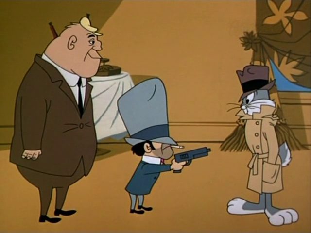 One could find a statement in their cartoon presence, however, were one tempted to ruminate about such meaningless things (and I am always one to do so). Bugs’ nemeses tended to be either animal, moron hunter-guy, or over-excited, over-mustachioed cowboy. Pitting Bugs against two criminals from the organized underworld, at least one of whom is portrayed as something more than a hapless goon, is perhaps a statement to the absolute fallibility of man. A window into humankind’s eventual descent from the top of the food chain.