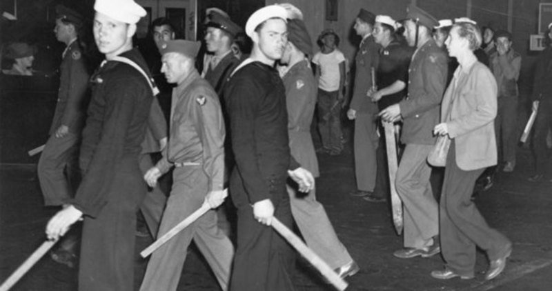 Those 200 sailors reached their destination, then started walking down the road, clubbing anyone wearing an offensive suit of excessive zoot. Many of their victims were 12 and 13-year-old boys, forging their first experiments into feeling cool. Any adults who stepped in to stop the sailors were similarly thwacked. Many of the beaten boys were stripped to their underwear, with their suits tossed into a large bonfire.