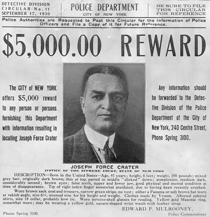 The reality is that Joseph Crater was a corrupt bastard, and he may have died the way corrupt bastards are destined to die: via some shadowy act of evil in the black of night. Or maybe he simply liquidated his assets and went on the permanent lam. For decades afterward, the term to “pull a Crater” was colloquial slang for making a sudden disappearance. If nothing else, at least Crater contributed a punchline to the lexicon for a while.